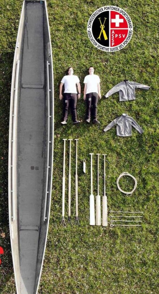 1 Übersetzboot oder Weidling, 1 Sasse, 2 Pontoniere, 3 Ruder, 3 Stachel und 4 Ruderstricke. Fertig.